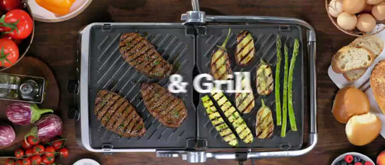 Precision grilling with independent temperature control for each plate. The BBQ & Press Grill has been designed to deliver perfectly pressed paninis and sandwiches, delicious burgers, seared steaks to golden waffles. Do it all with reversible and ceramic griddle, flat and waffle plates*. The possibilities are endless with open BBQ mode which doubles your space to create!